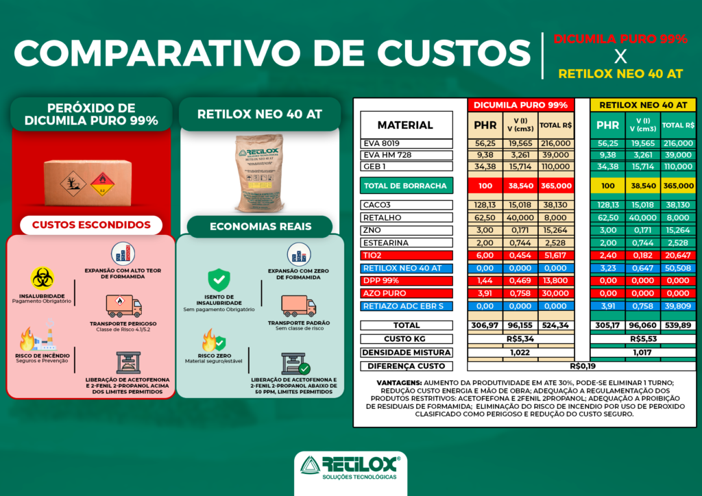 Muitos transformadores hesitam em migrar para tecnologias mais limpas por acreditarem que o Peróxido de Dicumila Puro oferece um custo de fórmula imbatível. No entanto, os números mostram que a economia direta é ilusória quando comparada aos ganhos operacionais.